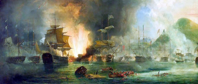 Λίγο αργότερα, οι στόλοι των τριών δυνάμεων, με τους ναυάρχους Έυντεν, Δεριγνύ και επί κεφαλής τον Άγγλο Κόδριγκτον κατέπλευσαν στην Πελοπόννησο για να επιβάλουν την ανακωχή. Με τους αντίπαλους στόλους παραταγμένους στον κόλπο του Ναυαρίνου, ήταν η τουρκική προκλητικότητα, οι ασαφείς οδηγίες των Ευρωπαίων, η πρωτοβουλία του Κόδριγκτον και ίσως και η τύχη της Ελλάδος, που συνηγόρησαν στο να προκληθεί ανάφλεξη. Η ναυμαχία κατέληξε σε ολοσχερή καταστροφή του τουρκοαιγυπτιακού στόλου. Η Ρωσσία και οι φιλελεύθεροι Γάλλοι αντέδρασαν με ικανοποίηση και χαρά, η Αυστρία με αποδοκιμασία, η Αγγλία με σκεπτικισμό και οι Έλληνες με ενθουσιασμό και αναπτέρωση του ηθικού τους. Η Τουρκία συντετριμμένη και εξοργισμένη κήρυξε ιερό πόλεμο18.